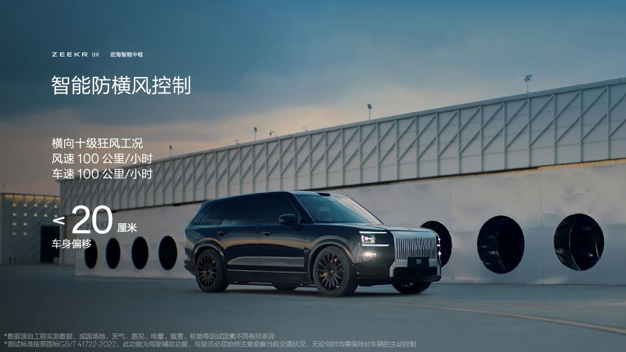 依托定海智能中枢的强大能力,极氪9X不仅可以抑制日常坑洼路面和弯道绕桩的颠簸和侧倾,还可实现爆胎、狂风等多种极限场景下的极致安全。在时速120公里同侧双胎全爆的危险情况下,极氪9X可基于定海智能中枢,在200毫秒内定位爆胎位置,并完成制动力精准分配,让车辆始终保证直线行驶,同时瞬间调整悬挂刚度,维持车身平衡,直至安全刹停。此外,在时速100公里遭遇10级横向狂风时,极氪9X仍可将车身偏移控制在20厘米之内。