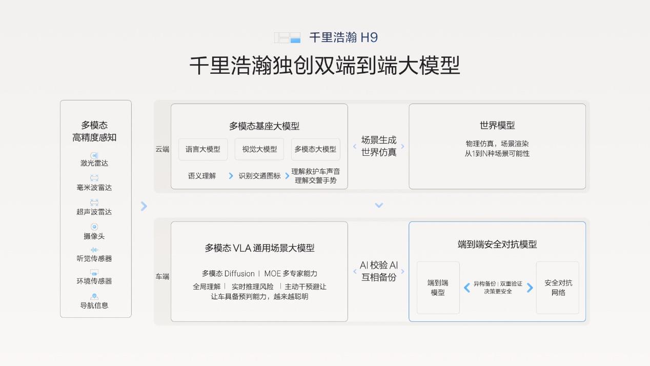 此外,千里浩瀚H9的Smart AI Agent技术架构,在多模态VLA基础上,部署了独创的「端到端安全对抗模型」,第一次实现了「双端到端大模型」算法的互相验证,让用户得到双倍安全保障。