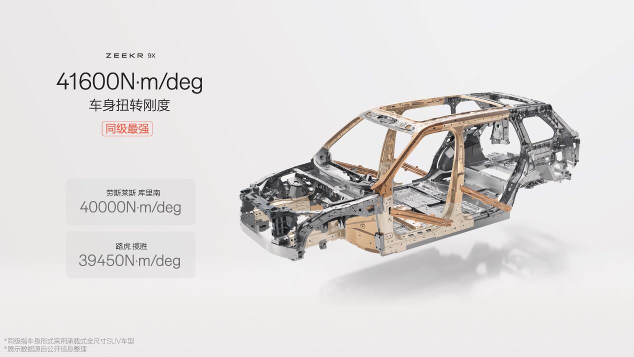 为保障第三排尾撞安全,极氪9X通过第三代一体式压铸后端铝车身,让原本需要80多个零部件后车身减少至3个,焊点减少1000多个,车身刚度大幅提升,形变量降低16%,可通过时速105公里的追尾测试。车身材料与生产工艺的双重进化,让极氪9X的车身扭转刚度达到41600牛·米每度,承载式车身的全尺寸SUV中最高。