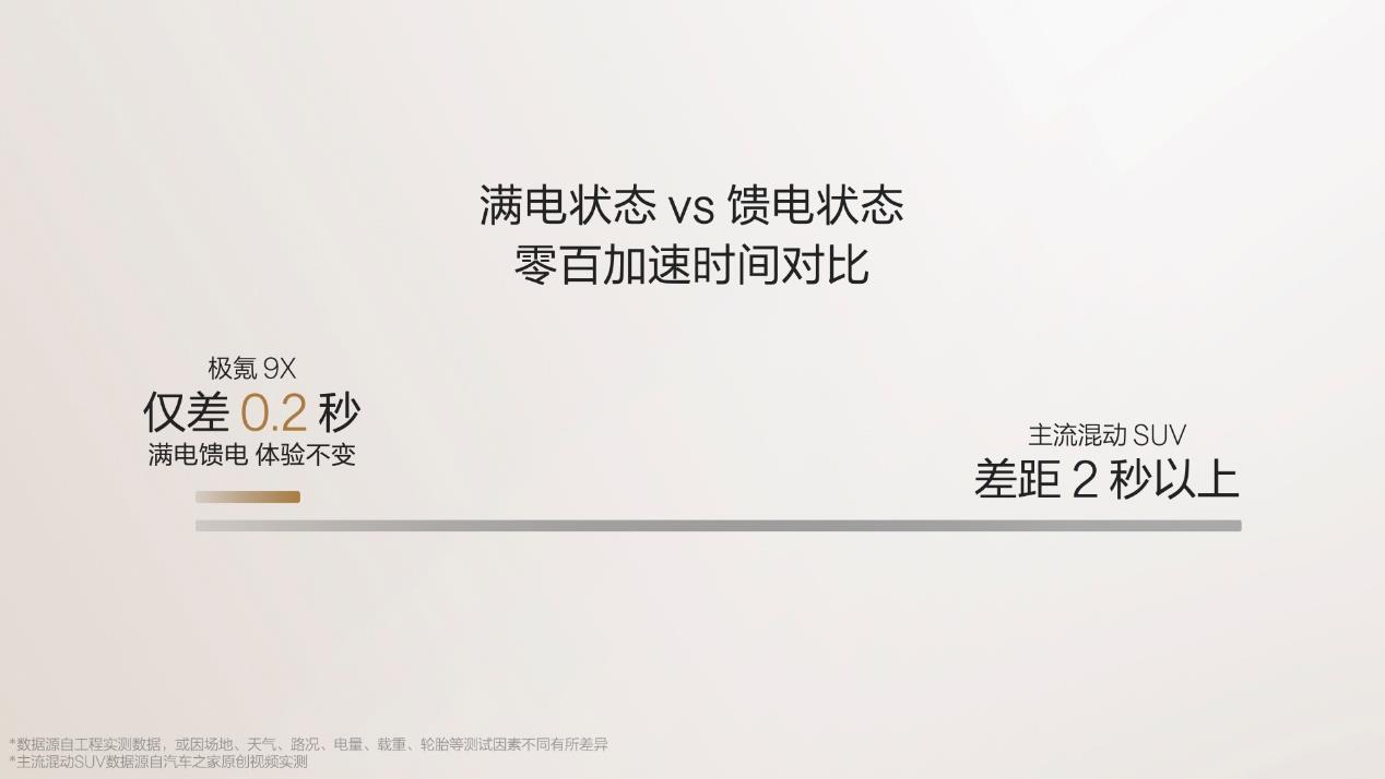 极氪9X搭载混动领域第一套兆瓦电驱,最大输出功率1030千瓦,最大马力超过1400匹,实现零百加速最快3.1秒的极致性能,全球混动SUV中排名第一,最高时速可达240公里,全球所有全尺寸混动SUV中排名第一。此外,极氪9X采用全栈自研的全球第一台最大功率超过200千瓦,且综合热效率突破46%的2.0T超级电混专用发动机,在急加速超车、大角度爬坡,以及高海拔地区等极端工况和环境下,动力响应随叫随到。即便是20%低电量馈电状态下,零百加速依然保持3秒级,时刻保持强劲动力,百公里综合油耗还较搭载1.5T发动机的同级产品低5%~10%,实现了效率和性能双重极致。