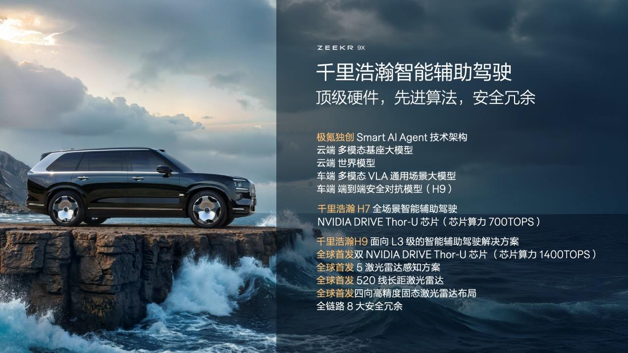 作为代表千里浩瀚智能辅助驾驶系统最高水准的旗舰车型,极氪9X在千里浩瀚H9版本上,全球首发双NVIDIA DRIVE Thor-U芯片,成就智能时代的“聪明大脑”。极氪9X以底层硬件升级,算法架构迭代,功能场景再拓展,为用户带来产品全生命周期都领先的智能体验。
