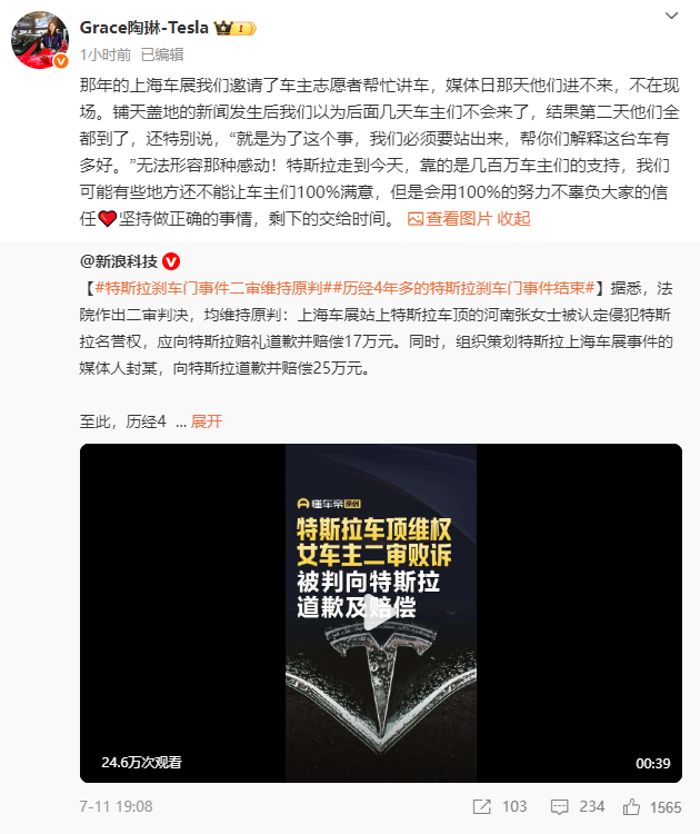 7月14日,特斯拉公司副总裁陶琳今日转发了“特斯拉刹车门事件二审维持原判”相关报道,并发表了自己的看法。