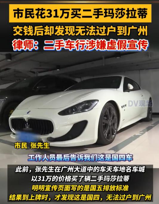 7月18日报道,广东广州。此前,张先生在广州大道中的车天车地名车城,以31万的价格买了辆二手玛莎拉蒂。购车过程中,张先生明确自己要的是“国五”排放标准的车型,因为这才可以过户到广州。但付了全款后,到车管所办理过户手续,张先生才发现说好的“国五”变“国四”,车子也无法过户到广州。因此,张先生希望商家全额退款,但工作人员却以消极态度处理。针对张先生的遭遇,律师指出,该二手车行的行为已涉嫌虚假宣传。