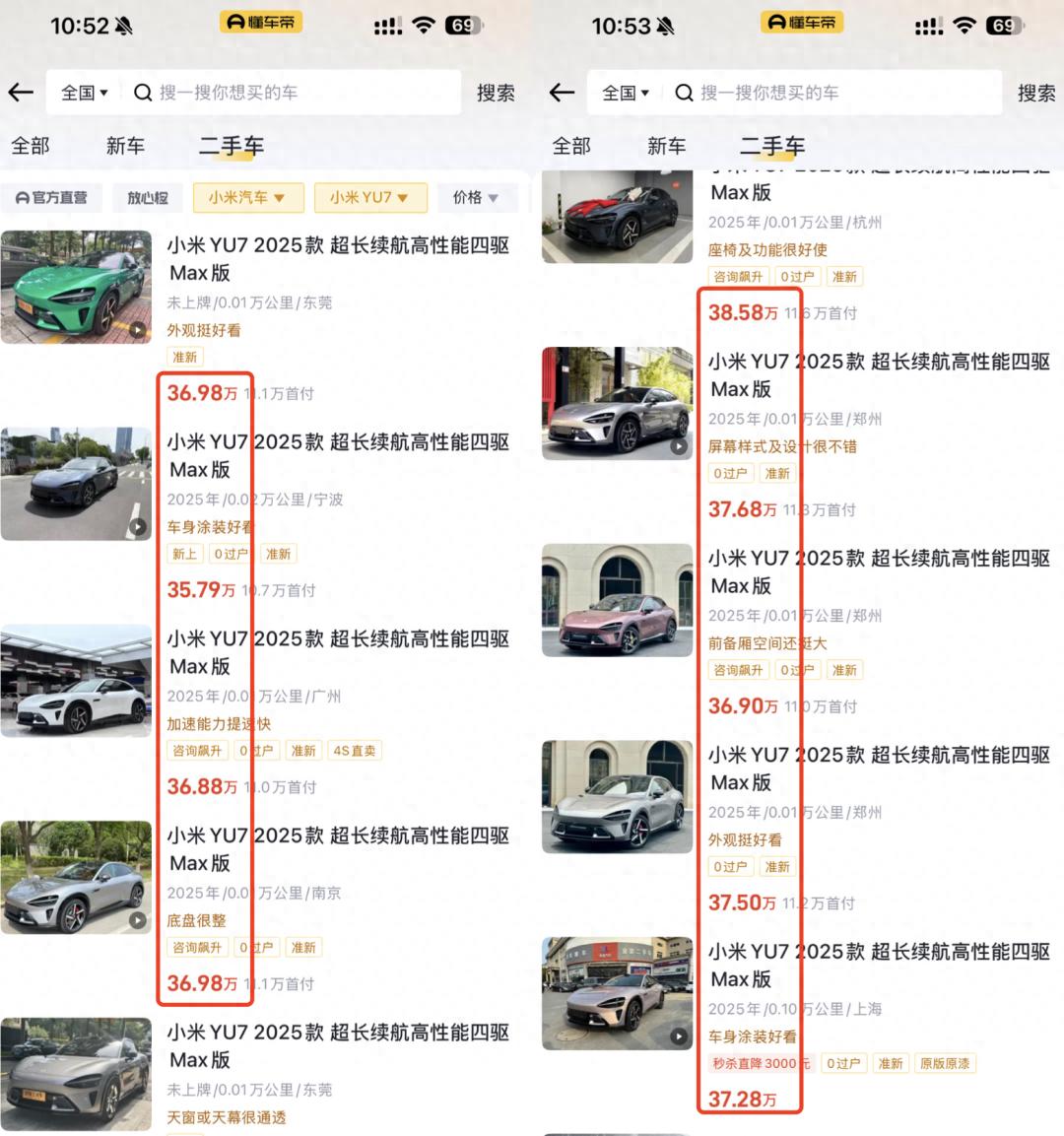 记者了解到,这些准新车的来源主要分为两类,一是部分专业车商在发布会当天就抢订了首批现车,待车辆交付后立即加价转手;另一类是二手车商从首批车主手中溢价收购后再次加价出售,形成“二次加价”现象,这种层层加价的模式直接推高了二手小米YU7的价格。
