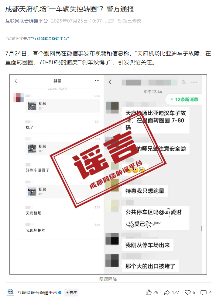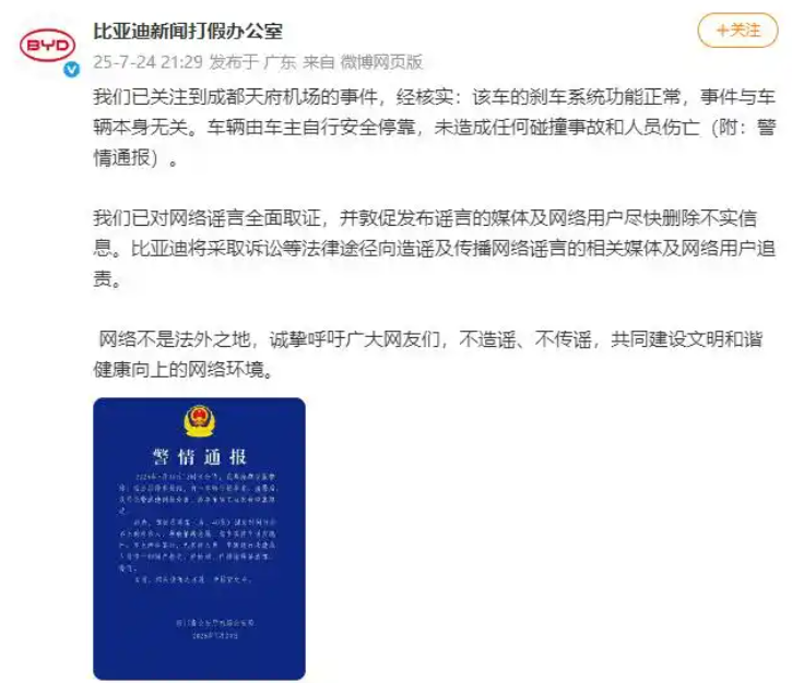 即便是在24日四川机场公安警情通报和比亚迪官方澄清之后,网络上仍有不少好事者质疑警情通报,诸如“通报为何没有盖公章”的问题……7月25日,中央网信办通过微信公众号再次为事件辟谣,同时再次转发了四川机场公安的警情通报。