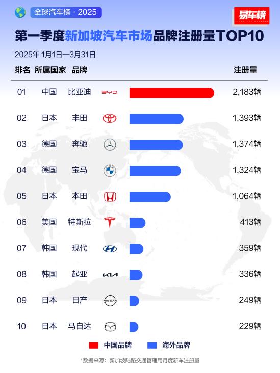 新加坡:比亚迪以0.22万辆销量稳居全品牌第一,市占率达20%。其主力车型元PLUS持续热销,令同期丰田销量(0.14万辆)“望迪兴叹”。自2024年成为新加坡全品牌销冠后,比亚迪进一步扩大领先优势。