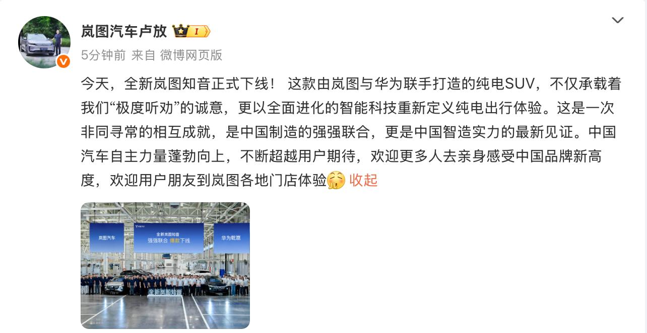 岚图CEO卢放也在社交媒体发文定调,与华为联合共研的全新岚图知音下线,不仅承载着岚图“极度听劝”的诚意,更展现出岚图以全面进化的智能科技重新定义纯电出行体验。与华为合作是中国制造的强强联合,更是中国智造实力的最新见证。