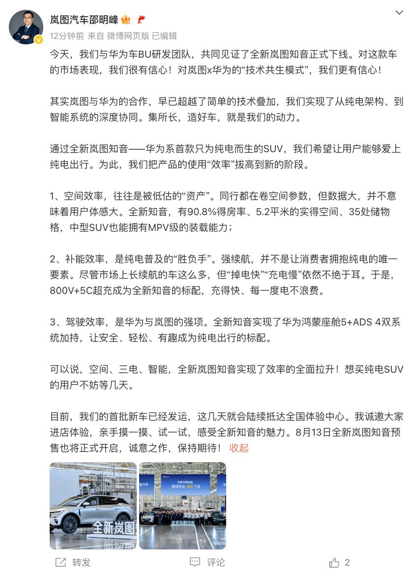 岚图汽车CBO邵明峰在微博上介绍,全新岚图知音在空间、三电、智能层面的使用效率实现了全面拉升。