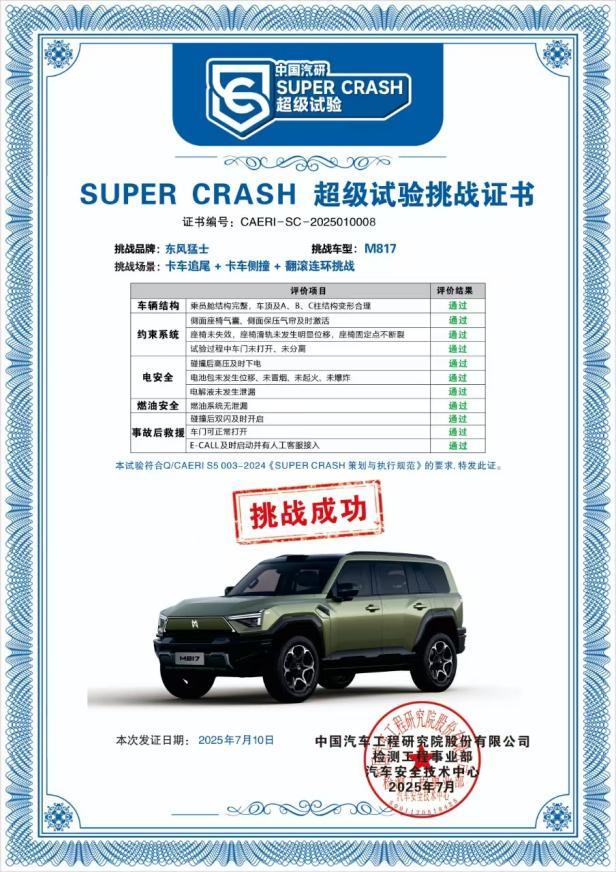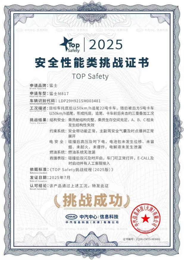 在用户最为关心的电池安全方面,猛士M817搭载宁德时代越野专用电池,采用“9层电池包+1300MPa一体冲压热成型钢板”10层防护,通过10倍国标的机械振动测试、200倍国标的浸水测试、4倍国标的机械冲击测试;智能BMS电池管理系统24小时监测电池健康,提前预警风险,确保越野磕碰、涉水时电池安全;并且通过行业新能源电安全最全面、测试标准最严苛的中汽中心的NESTA六维电安全认证。