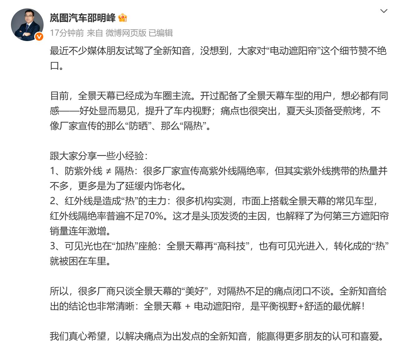 在特斯拉引领的“极简设计”风潮下,全景天幕一度成为众多新能源车型的标配。然而,用户在实际使用中却饱受“头顶煎烤”之苦,被迫自掏腰包购买第三方遮阳帘。8月15日,岚图汽车CBO邵明峰在社交平台直言不讳,将这种设计称为“流量怪象”,并介绍全新知音全系标配电动遮阳帘,回归用户体验本位。