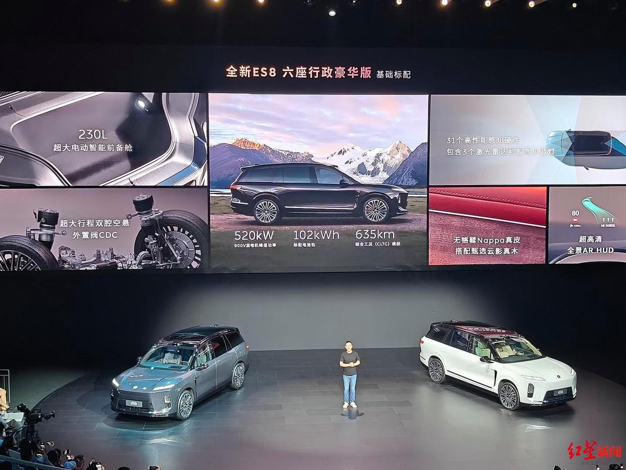 李斌表示,全新ES8标配即顶配。六座行政豪华版标配520kWh 900V双电驱,百公里加速3.97s;102kWh电池,CLTC续航里程635km;超大行程双腔空悬外置阀CDC;31个高性能感知硬件,包括3个激光雷达和智驾小蓝灯;超高清全景AR HUD;21.4英寸车规级mini-LED天空屏;天琴8.1.4.2沉浸声系统;同级唯一的三把零重力座椅;21英寸轮毂;ADB自适应矩阵大灯;800万像素超清流媒体后视镜等配置。另外两个版本车型在此基础上增加和调整了一些配置。