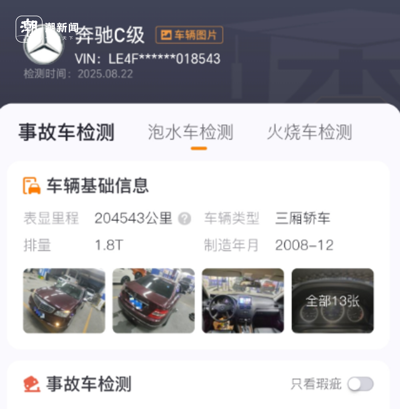 8月22日,沈先生向杨旭提供了查博士提供的事故排查检测报告,显示这辆奔驰C级车的检测结果跟二手车商描述的基本一致。特别值得一提的是,报告里标注的表显里程数为204543公里。