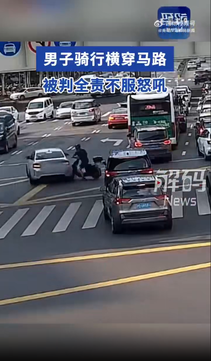 交警到场勘查后认定,男子驾驶非机动车横过机动车道未下车推行,负事故全部责任。然而该男子对此大为不满:“看不到我他开什么车呀!”“机动车撞人,肯定他有主要责任!”