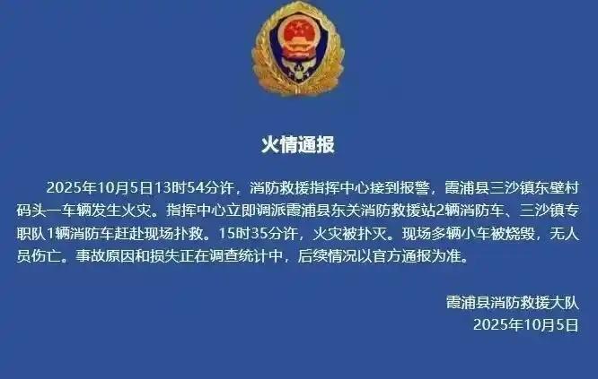 霞浦县消防救援大队随后发布火警通报,明确事故关键信息:2025年10月5 日13时54分,消防救援指挥中心接到报警,称霞浦县三沙镇东壁村码头有车辆起火。指挥中心立即调派霞浦县东关消防救援站2辆消防车、三沙镇专职消防队 1 辆消防车赶赴现场扑救;至15 时35分许,火灾被成功扑灭。现场多辆小车因火势烧毁,万幸无人员伤亡。目前,事故具体原因及财产损失仍在调查统计中,后续进展将以官方通报为准。