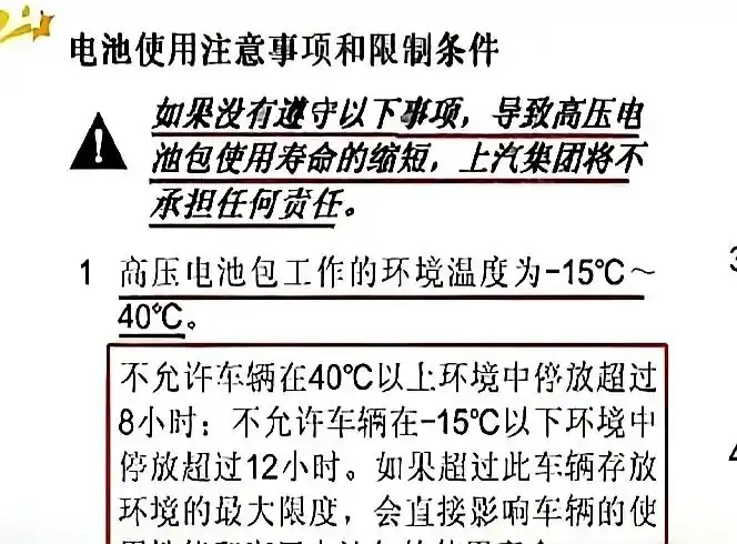 值得注意的是,业内人士指出,多数新能源汽车对停放环境温度有明确限制,车企通常会在说明书中标注相关要求。例如,特斯拉Model Y的说明书中明确写道:“请避免将Model Y持续暴露在高于60℃或低于- 30℃的环境下超过24小时”;上汽某款新能源汽车的说明书也提到:“不允许车辆在40℃以上环境中停放超过8小时,也不允许在- 15℃以下环境中停放超过12小时”。若违反此类提示,不仅会导致电池寿命大幅衰减,更严重的是,极端高温可能触发电池热失控,进而直接诱发车辆自燃。