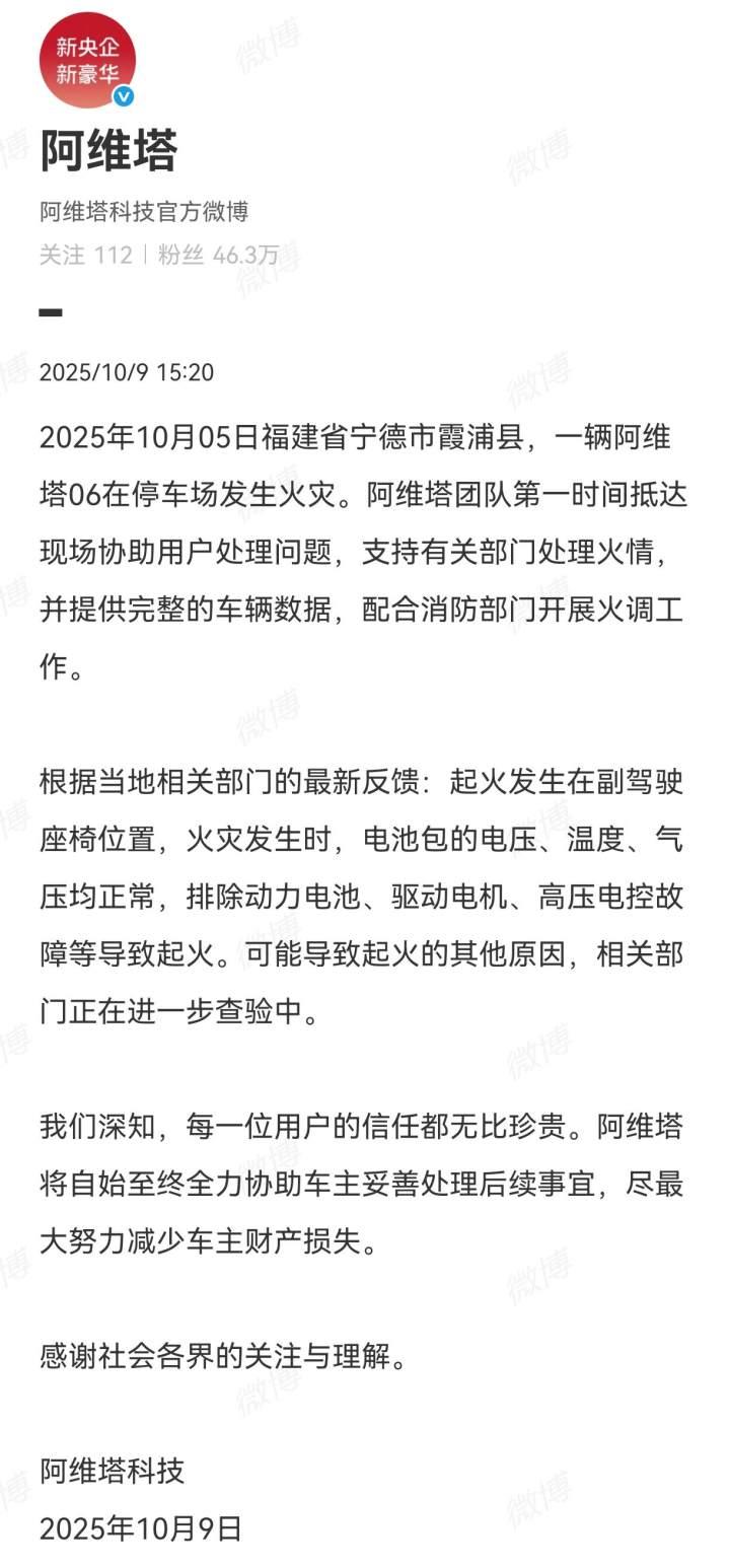 关于起火原因,10月9日下午阿维塔官方发布说明:根据当地相关部门的最新反馈,起火发生在副驾驶座椅位置,火灾发生时,电池包的电压、温度、气压均正常,排除动力电池、驱动电机、高压电控故障等导致起火。可能导致起火的其他原因,相关部门正在进一步调查中。