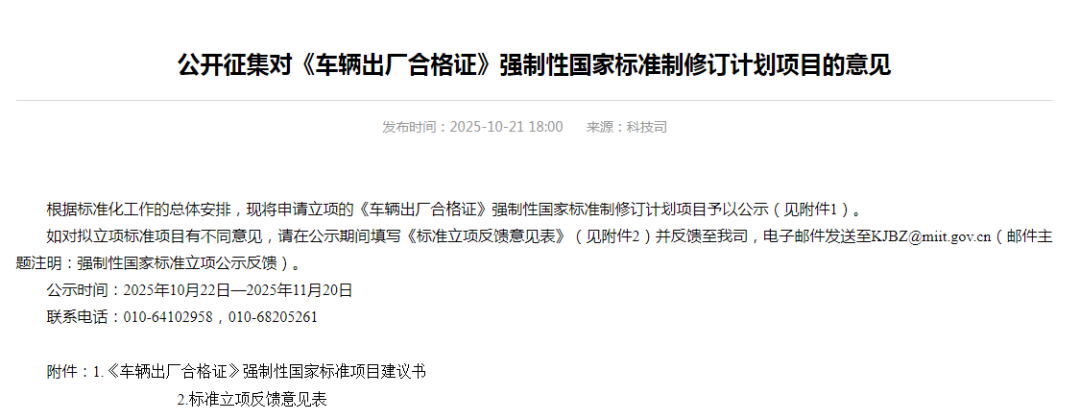 工信部征集对《车辆出厂合格证》强制性国家标准制修订计划项目的意见