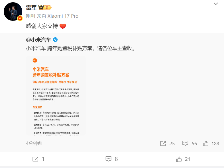 小米方面表示,凡在2025年11月30日24时前完成锁单,因小米汽车生产、运输等原因导致车辆需到2026年完成开票交付的用户,可享受“跨年购置税补贴”。