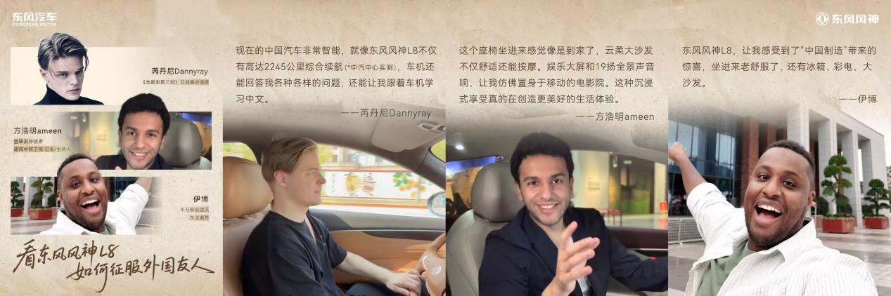 东风风神方面,结合国庆节期间用户出行场景及家国情怀热点,打造“国际友人走进东风博物馆”的创意社会事件。特邀伊拉克驻新华社记者方浩明、索马里籍抖音达人伊博及《志愿军第三部》艾迪曼扮演者芮丹尼,共访湖北十堰东风博物馆。嘉宾们沉浸式体验东风“芦席棚精神”“干打垒精神”与“马灯精神”,深刻感受到中国汽车工业从艰苦创业到技术创新的非凡跨越。在驾驶东风风神L8后,各位外国友人对其卓越的产品力和出色的驾乘体验给予了高度认可,并表示东风汽车的发展是中国制造业腾飞的生动缩影,中国汽车产业不仅在技术上实现了领先,更以开放包容的姿态向世界传递着创新与品质的力量。