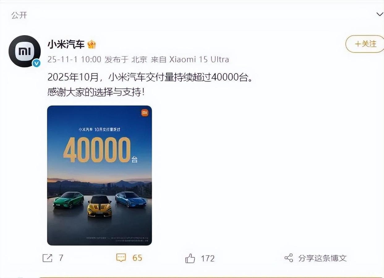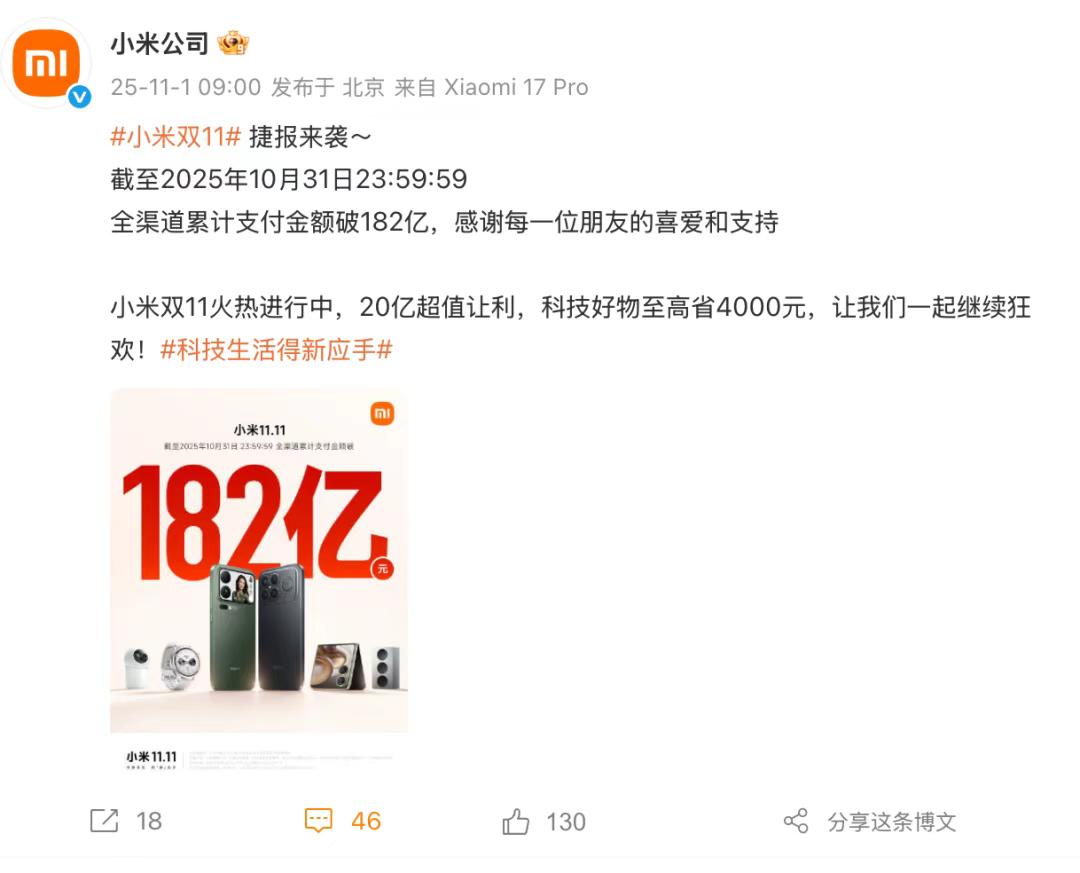 小米汽车宣布,2025年10月,小米汽车交付量持续超过40000台。此外,@小米公司:截至2025年10月31日23:59:59,全渠道累计支付金额破182亿。