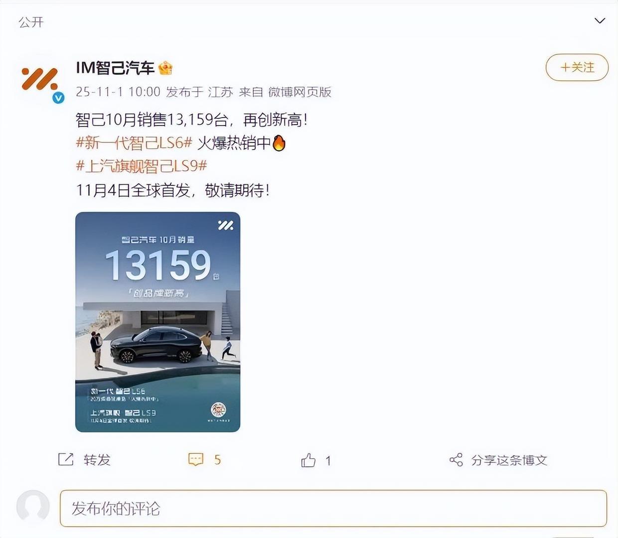 智己汽车宣布,10月销售13159台。上汽旗舰智己LS9将于11月4日全球首发。