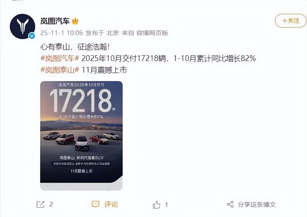 据岚图汽车官方微博,岚图汽车2025年10月交付17218辆,1-10月累计同比增长82%。