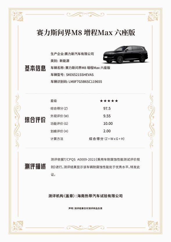12月19日,中国汽车耐腐蚀与老化性能评价(CA-CAP)测评结果正式揭晓,问界M8增程MAX六座版凭借在外观、功能和划痕评价三大方面的亮眼表现,在多款热门参评车型中脱颖而出,荣获整车耐腐蚀性能测评“白金等级”证书,并以97.5的综合评分摘得最高五星评级。该成绩不仅是本届测评的最高得分,更刷新了CA-CAP历史认证车型最高分纪录。