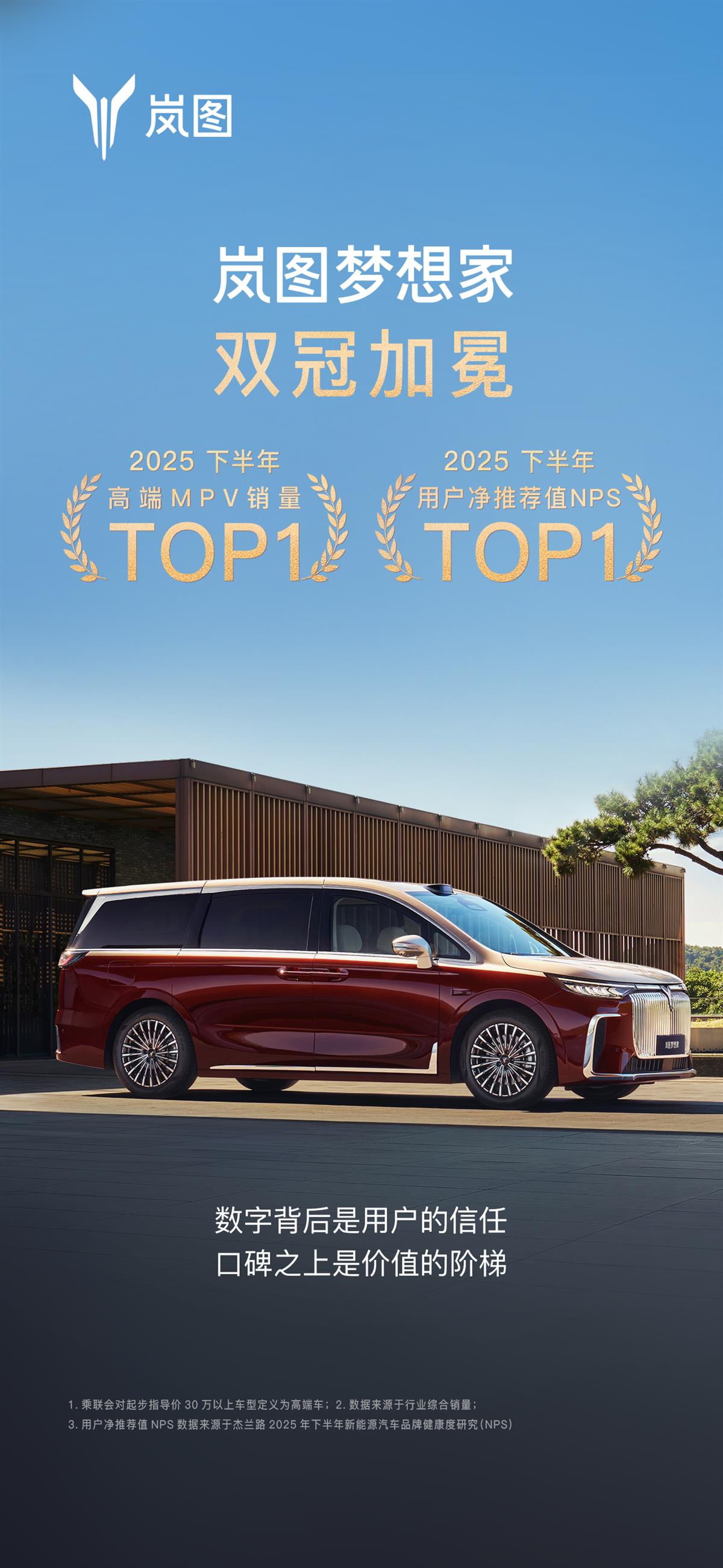 双冠的背后,是两种截然不同的胜利:销量第一,是产品在广阔市场中经受住严苛检验的证明,意味着岚图梦想家已通过市场检验,成为消费者用真金白银投票的成熟产品;NPS第一,则意味着岚图梦想家成为用户心中最值得推荐的新能源MPV,形成了口碑效应与圈层认同,在用户心智中构筑了难以撼动的信任与偏好。两者合一,标志着岚图梦想家完成了从“被选择”到“被推崇”的质变。凭借这双重权威认证,岚图梦想家正在重新系统性定义高端MPV的价值体系和价值标尺。