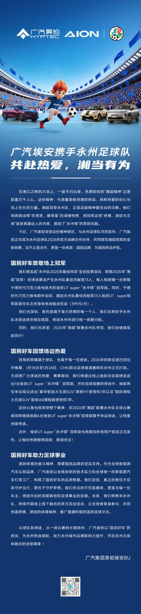 同时,在1月18日至24日于永州举办的CMG群众足球邀请赛期间,广汽埃安将通过线上抽奖向全国球迷送出1台埃安UT super“永冲锋”冠军版;并在现场观赛的球迷中,抽取两位幸运观众送出“豪华智能大五座SUV”昊铂HT使用权1年,以及“国民增程大五座SUV”埃安i60增程版使用权1年。更让人期待的是,在2026年“湘超”联赛永州队主场比赛期间,广汽埃安将继续抽取6台埃安UT super赠予幸运球迷。这一系列动作,形成了贯穿赛季的品牌互动体系。