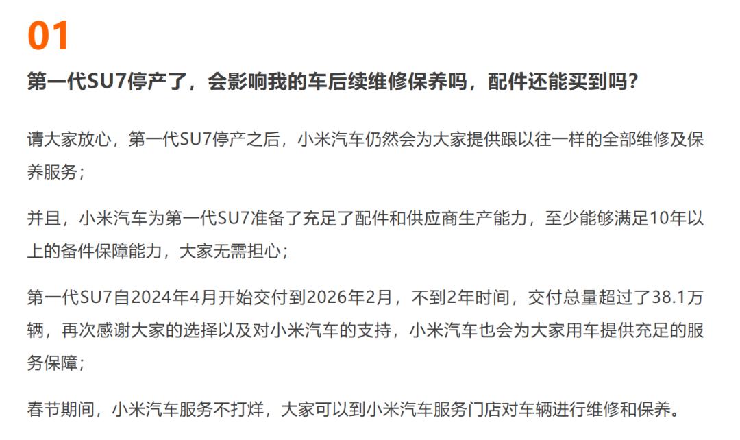 小米汽车2月12日晚间发布答网友问,文中提到,第一代SU7停产之后,小米汽车仍然会为大家提供跟以往一样的全部维修及保养服务;并且,小米汽车为第一代SU7准备了充足了配件和供应商生产能力,至少能够满足10年以上的备件保障能力,大家无需担心。