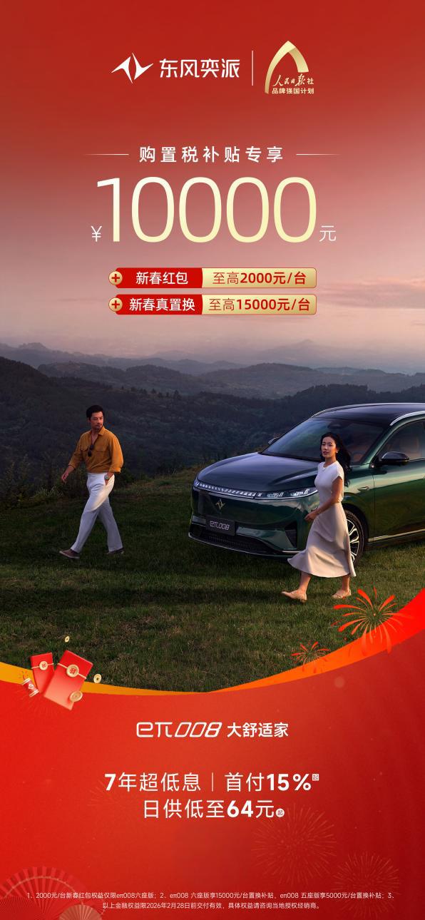 备受家庭用户青睐的“大舒适家”奕派008,以“真满配、真智能、真超值”全能产品力满足用户多元化需求。值新春之际,推出限时10000元专享购置税补贴、至高15000元置换补贴等福利;此外,即日起至2月28日前,凡在东风奕派官方APP/小程序下订奕派008的用户,还可领取2000元“马利”红包,为新的一年增添“马上有利”好彩头!在金融端,还推出7年超低息、首付15%起、日供仅64元起购车政策,让更多家庭轻松升级出行品质。作为家庭SUV的价值标杆,奕派008以更高品质、更具温度的体验,重新定义家庭出行新高度。