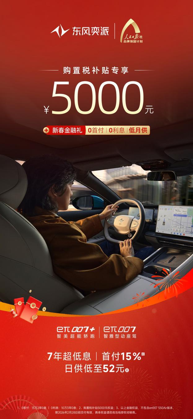 好车不等人,福利限时享!从产品到服务,从权益到体验,东风奕派始终坚持以用户为中心,回馈每一份信赖与选择。开年购车正当时,除以上车型,“大美智能国民车”纳米01也携4000元购置税补贴、5年0首付0利息的新春金融礼等权益而来,为消费者带来更丰富的出行体验。东风奕派这份“开年大礼”多重权益不断加码,此时入手新车正是最佳时机!别再犹豫,诚邀广大消费者莅临东风奕派授权门店试驾品鉴,把心仪爱车带回家,与家人朋友开启不“奕”样的美好新年旅程。