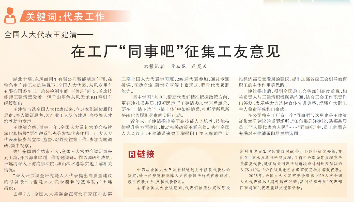 2026年全国两会召开在即,2月26日,《人民日报》聚焦全国人大及其常委会履职工作,以鲜活的代表履职故事展现全过程人民民主的实践成果,全国人大代表、东风商用车有限公司整车工厂总装检测车间“王涛班”班长、首席技能师王建清扎根一线征集工友意见、用心用情履职的事迹获重点报道。作为东风汽车集团有限公司(以下简称东风汽车)的优秀产业工人代表,王建清始终以“工匠之心”守岗位,以“代表之责”传民声,成为东风人践行初心使命、积极担当作为的生动缩影,也彰显了东风汽车厚植人才沃土、培育时代工匠,以实干助力中国式现代化建设的责任与担当。