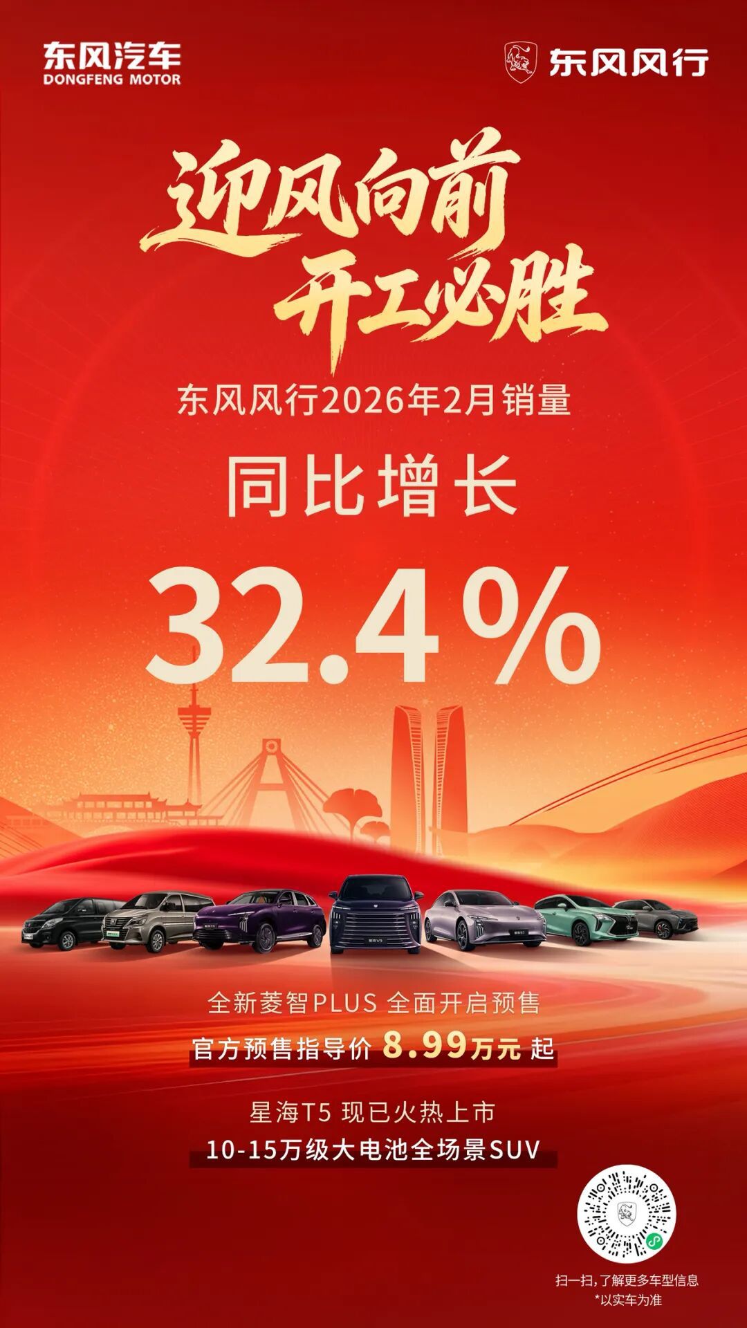 春日启新程,奋进正当时。东风汽车集团有限公司(下称东风汽车)凭借强劲的发展势头,交出了一份亮眼成绩单。2026年1-2月,东风汽车累计销售汽车29.6万辆,同比增长6.3%,其中新能源汽车销售12.4万辆,同比劲增50.4%;出口5.3万辆,同比大涨62.8%,新能源出口更实现106.8%的爆发式增长。这份沉甸甸的销量数据,印证了市场对“东风造”品质的高度认可,更彰显出东风汽车在新能源、智能化、国际化转型道路上“马力全开”的强劲势能。