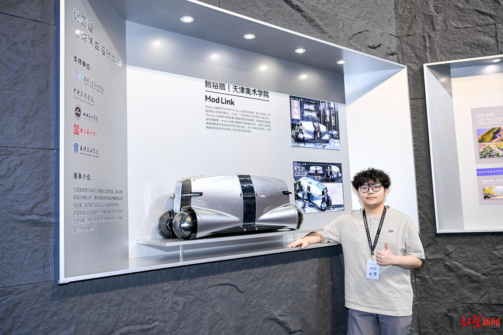前段时间,成都艺体中学毕业生赖裕顺凭借作品《Mod Link》一举夺魁,成功斩获2025年比亚迪全球汽车设计大赛冠军及最佳外饰设计奖两项殊荣,并从比亚迪股份有限公司董事长兼总裁王传福手中接过奖杯。