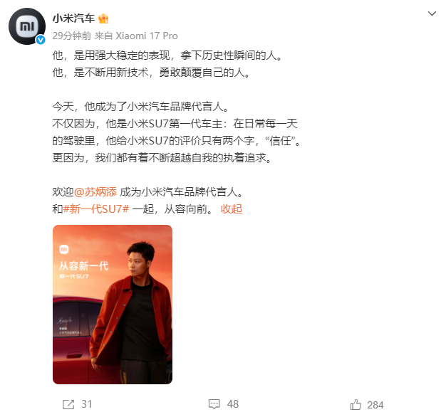 3月17日,小米汽车宣布,苏炳添成为其品牌代言人。