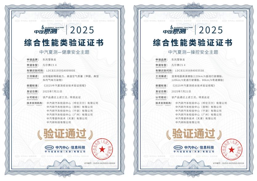 凡尔赛C5 X曾荣获中国十佳车身、C-NCAP五星安全认证、中汽研“驾乘品质之星”等权威背书。2023年5月,凡尔赛C5 X 挑战国内首次高速连环追尾主被动安全联合测试,以12项验证项目全部合格通过的优秀成绩,获得“3A”评价;2025年7月,在2025中汽夏测中通过太阳辐射隔绝能力、高温空气质量及湿滑路面高速爆胎三大测试项目,荣获健康与操控双安全权威验证证书;2025年12月,在中汽中心极寒驾控安全主题技术验证中,以140km/h时速在压实雪面完成前轮爆胎测试,在20%坡度的冰雪路面上满载状态一次登顶成功,获颁“操控稳定性挑战”认证证书。一系列硬核荣誉印证了凡尔赛C5 X经得起推敲的卓越品质。