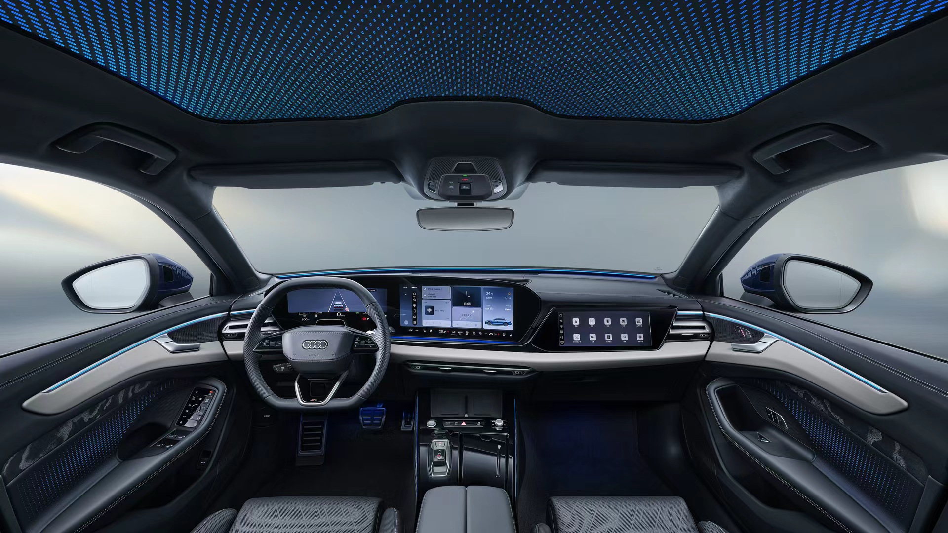 车内搭载的1.96平方米9分区智能全景天幕,依托六个可独立调控的区块,实现阳光与隐私的随心掌控。夜幕降临,由112颗RGB LED编织而成的银河星空顶,与30色氛围灯交互联动,在欢迎、能量、律动、小憩四种模式下,营造出惊艳的豪华光影效果。为了给用户的奢享旅程增加顶级听觉享受,全新奥迪A6L还配备了16扬声器的Bang & Olufsen豪华音响系统,用3D沉浸声场将每一次出行升格为殿堂级听觉盛宴。