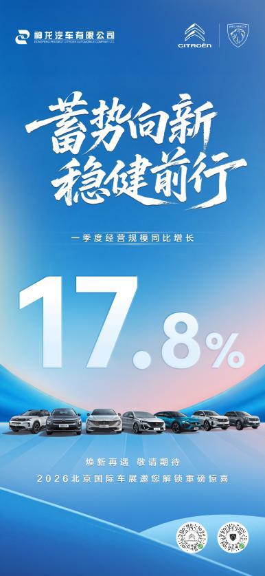 2026年是“神龙复兴三年行动”的开局之年。一季度,神龙汽车有限公司在去年经营持续向好的基础上,以“蓄势向新,稳健前行”的姿态,交出了一份扎实的开门红答卷——经营规模同比增长17.8%,为实现2026年全年目标打下坚实基础。这份成绩的背后,是神龙汽车团队抢时间、抢市场、抢订单的拼搏身影,也是双品牌坚决贯彻“在中国 为全球”战略,围绕“经营+项目”双主线全力推进的生动体现。在即将到来的2026北京国际车展,神龙汽车旗下东风标致、东风雪铁龙品牌焕新再遇,以全新面貌解锁品牌发展的又一重要篇章。