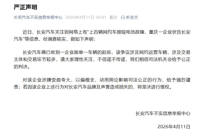 4月11日,长安汽车严正声明,近日,长安汽车关注到网络上有"上百辆网约车频现电池故障重庆一企业状告长安汽车"等信息,经调查核实,做如下声明: