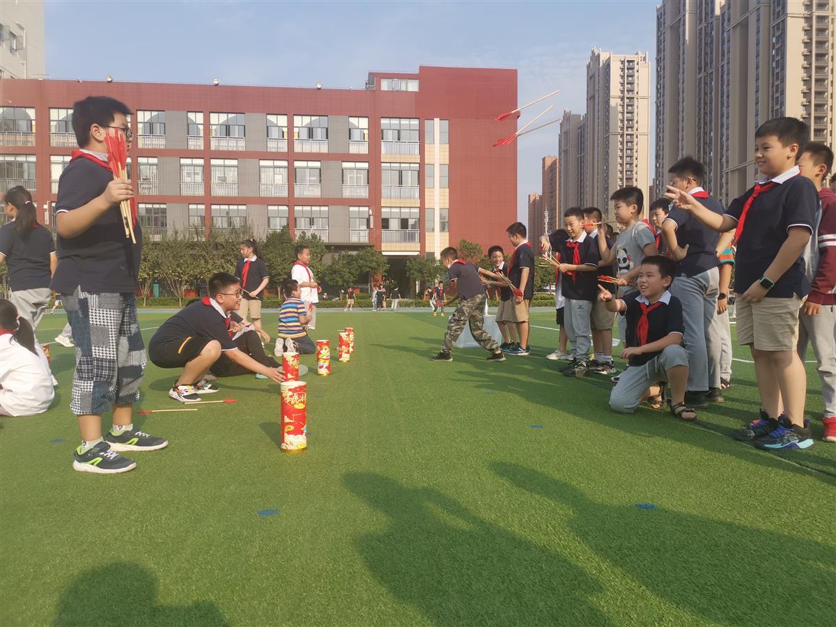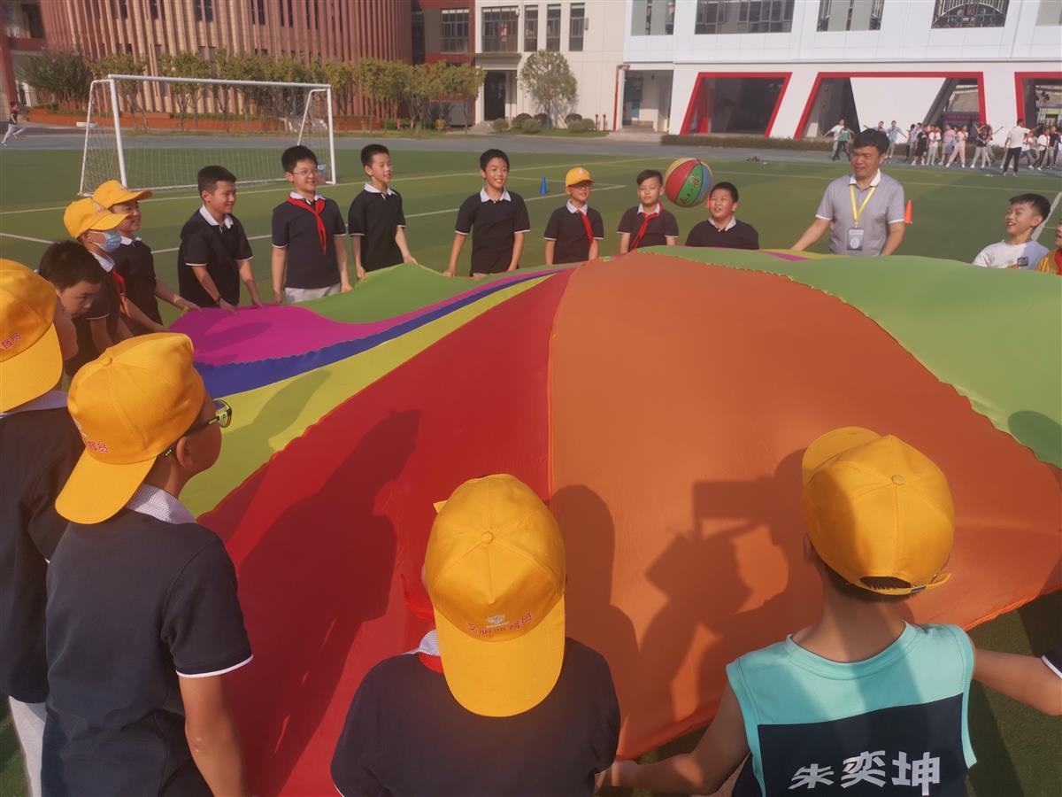 27日下午,极目新闻记者在该校北校区操场上见到的,是五年级的学生正在过“运动日”。有的学生拉着巨大的七彩布比拼颠球,有的分组坐在瑜伽球上接力赛跑,有的正合力突破跳长绳人数的纪录,还有的正在玩传统运动项目“投壶”。“音量”最大的是“车轮滚滚”项目——一个班学生分为四组,站在环形的布条内,像坦克履带一样前行,十分考验默契程度,因此孩子们的喊声、笑声格外响亮。