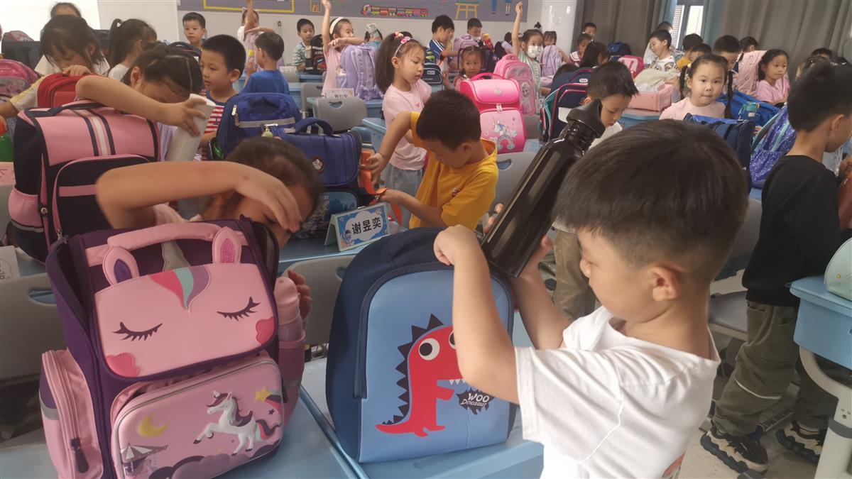 操场上很热闹,此时,一二年级的教室里也是一样。当天是这两个年级的“劳动日”,一年级新生正在学习收拾自己的书包,二年级则进阶为清理班级内务。