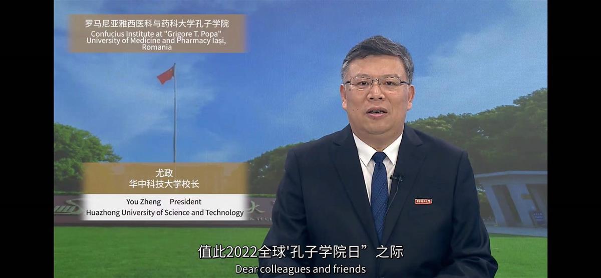 9月27日晚8时,中国国际中文教育基金会举办2022全球孔子学院日专场活动在线举行,华中科技大学与罗马尼亚雅西医药大学(简称“雅医大”)获批共建的雅医大孔子学院作为新成员首度亮相。作为主办学校与承办学校的代表,校长尤政与雅医大校长Viorel Scripcariu教授应邀以录播视频的形式在会上致辞,为活动送上祝福寄语。