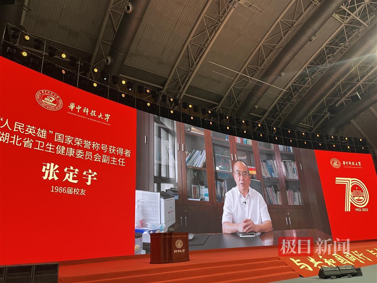 “我们的母校在新中国的朝阳中诞生,始终与祖国同行,与时代共进,为国家培养了成千上万优秀人才,遍及各行各业,为国家富强、民族振兴、人民幸福,作出了重要贡献。”大会现场,华科大1986届校友、“人民英雄”国家荣誉称号获得者张定宇为母校发来视频祝福。