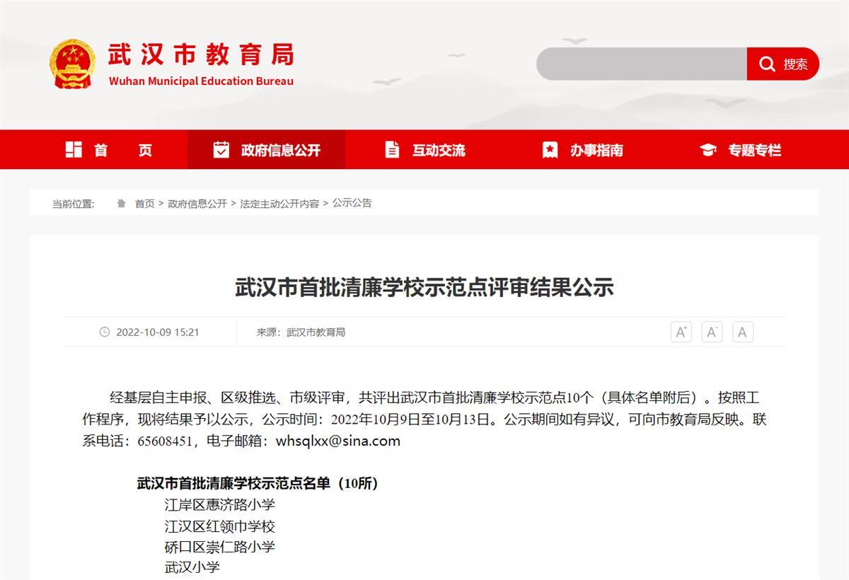 10月9日,武汉市教育局官网公布对首批清廉学校示范点评审结果进行了公示,江岸区惠济路小学、江汉区红领巾学校、硚口区崇仁路小学、武汉小学、武汉市第四十九中学等十所学校上榜。该结果公示时间为10月9日至10月13日,公示期间如有异议,可向市教育局反映。