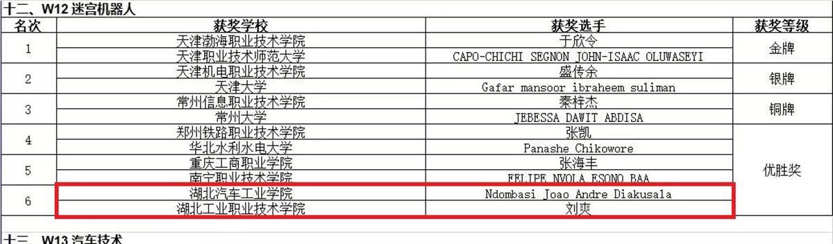 日前,首届世界职业院校技能大赛获奖捷报传来,湖北汽车工业学院电气与信息工程学院计算机203班的NDOMBASI DIAKUSALA JOAO ANDRE(中文名安杰)同学与原湖北工业职业技术学院刘爽同学共同组成的联队在大赛迷宫机器人比赛项目中取得第六名的好成绩,获得优胜奖。