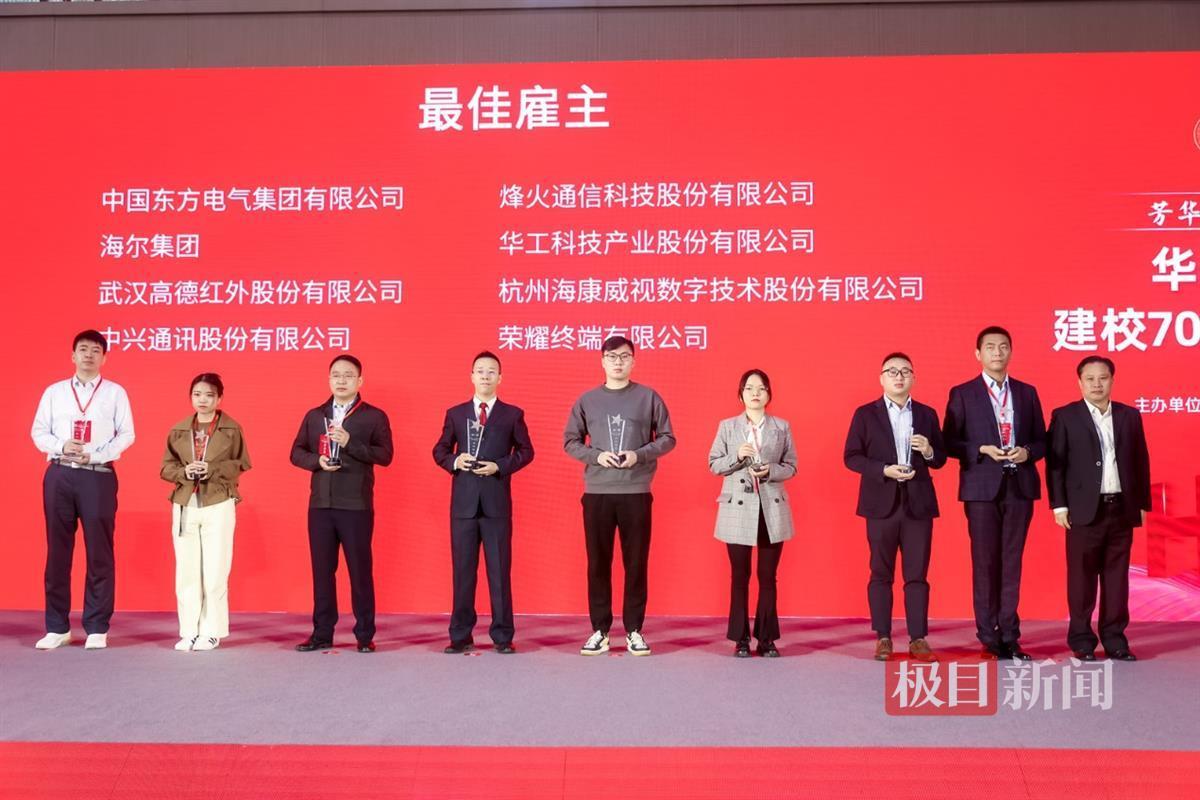 中车株洲电机有限公司副总经理、财务总监卢雄文校友,华工科技产业股份有限公司副总裁张勤校友,中国航天三江集团有限公司型号主任设计师杨元侠校友,深圳华大智造科技股份有限公司执行副总裁刘健校友结合自身发展,分别就行业发展、单位介绍、招聘需求等方面进行了企业宣讲。现场还为中国东方电气集团有限公司、烽火通信科技股份有限公司、海尔集团等企业颁发了最佳雇主奖。