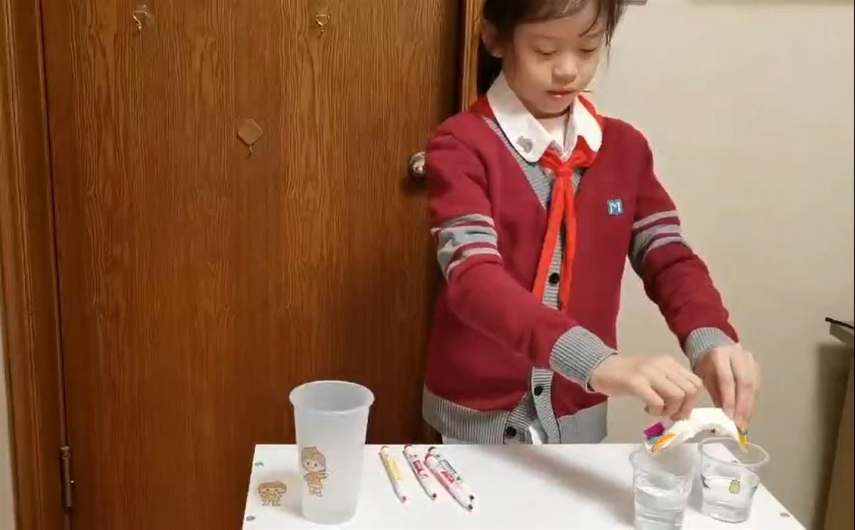 当天下午,在看过三位航天员所做的“重力环境下毛细效应实验”后,该校三、四年级的同学们,拿出提前准备好的卫生纸和不同颜色的水彩笔,在纸的两头用水彩笔染出四种不同的颜色,再将染好的纸折成四折纸巾,两头放进装满水的水杯,慢慢观察纸巾的变化。该校四年级(4)班学生卢瑾钰说:“我看到纸巾浸入水杯后,两边的颜色顺着纸往上爬,纸也变得湿润,太神奇了!”。