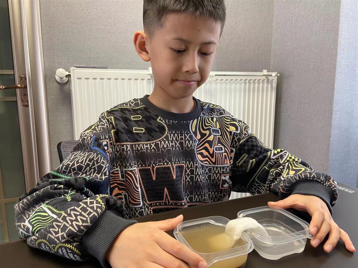 该校四年级(4)班的金晟宇同学,也根据他的理解,做出“毛细效应”实验。“我准备了一块纱布和两杯水,把纱布放进装有泥土的水杯后,被打湿的纱布并没有将泥水里的泥沙带进另一杯干净的水里,像纱布为水做了个过滤。”实验后,金晟宇还对实验原理进行了思考,他认为是因为纱布中的纤维,让纱布可以吸水但不能吸泥土,所以泥土和水就这样被分离了。