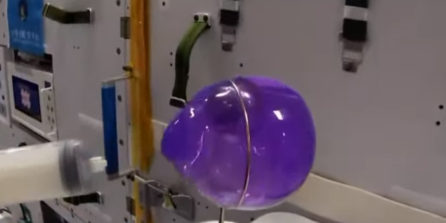 在空间站上,如果把一团水挤在空中,还是由于表面张力的作用,在空中就可以形成一个大水球,为了固定水球,可以把它放在一个带圆圈的支架上。但这种大水球是不稳定的,刘洋老师用大注射器吹一下,水球就晃动不停。但当把一颗大钢球放入水球中,水球就很快停止下来了,这是什么原理呢?其实,这个原理在生活中也很常见,当我们端一碗水的时候,水会晃动的挺厉害,但当我们把一张纸放入水中,水的液面就不容易晃动了。无论是空间站上的水球,还是地面上碗中的水,都是由于加入了其他固体产生了额外的“阻尼作用”,能量容易耗散,就能更快稳定下来。